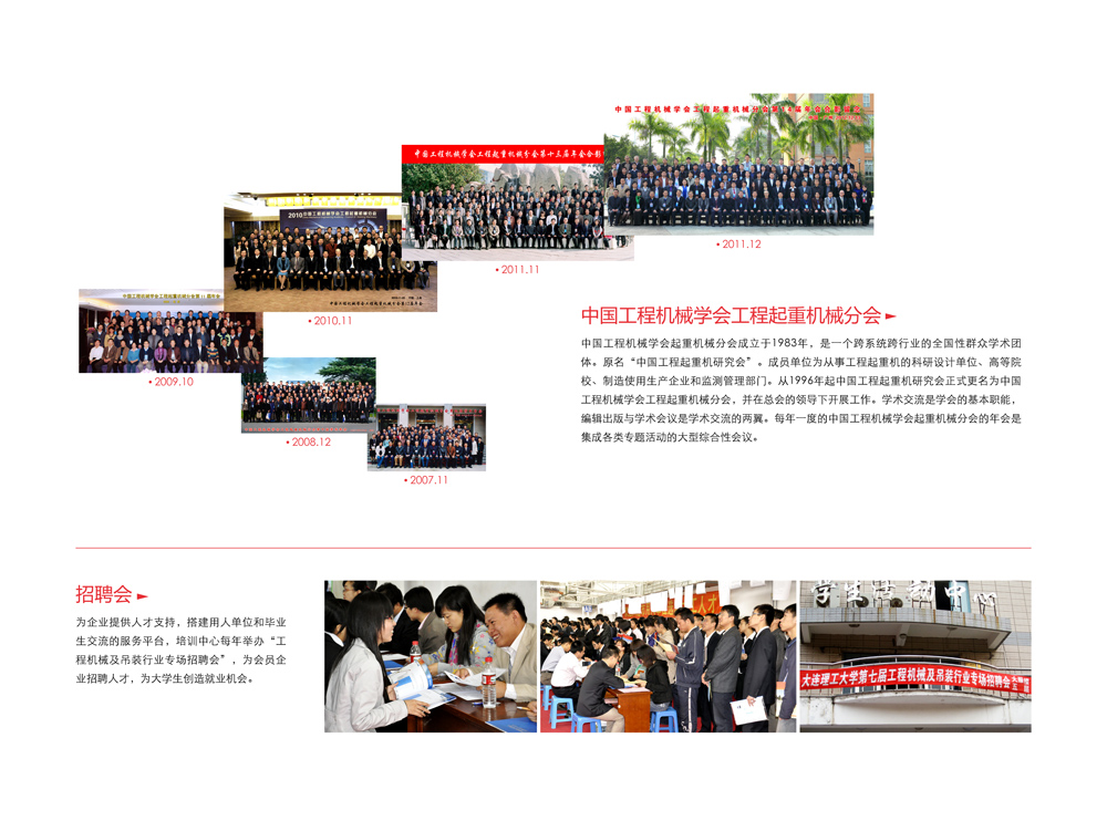 大連益利亞咨詢有限公司先后成功承辦中國(guó)工程機(jī)械學(xué)會(huì)工程起重機(jī)械分會(huì)第9~17屆年會(huì)、多屆大連理工大學(xué)機(jī)械及吊裝行業(yè)專場(chǎng)招聘會(huì)、起重機(jī)結(jié)構(gòu)高等分析研討會(huì)、國(guó)家標(biāo)準(zhǔn)GB/T 3811-2008《起重機(jī)設(shè)計(jì)規(guī)范》宣貫會(huì)、組建“工程起重機(jī)械產(chǎn)業(yè)技術(shù)創(chuàng)新戰(zhàn)略聯(lián)盟”專題研討會(huì)、工程機(jī)械博士論壇等會(huì)議。